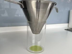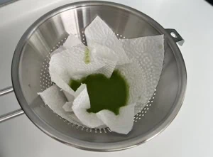 • Passer Ă©ventuellement dans une passoire avec Ă©ventuellement un essuie-tout (si vous souhaitez avoir une huile lisse et ne pas avoir de particules de coriandre ; personnellement j'aime bien quand il y a un peu de matiĂšre, mais c'est trĂšs personnel !)passoire pour huile de coriandre